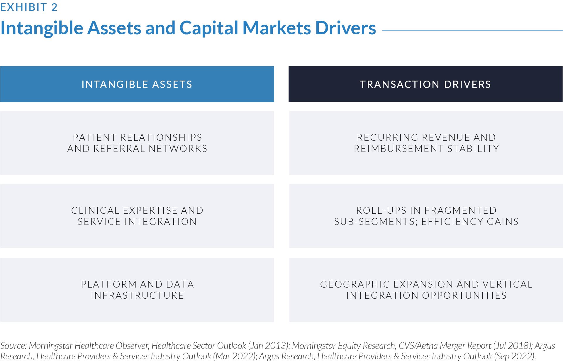 This section examines the sector through three lenses: market trends reshaping care delivery, intangible assets that drive premium valuations, and capital markets activity that reflects buyer strategies across consolidation, scale, and integration.