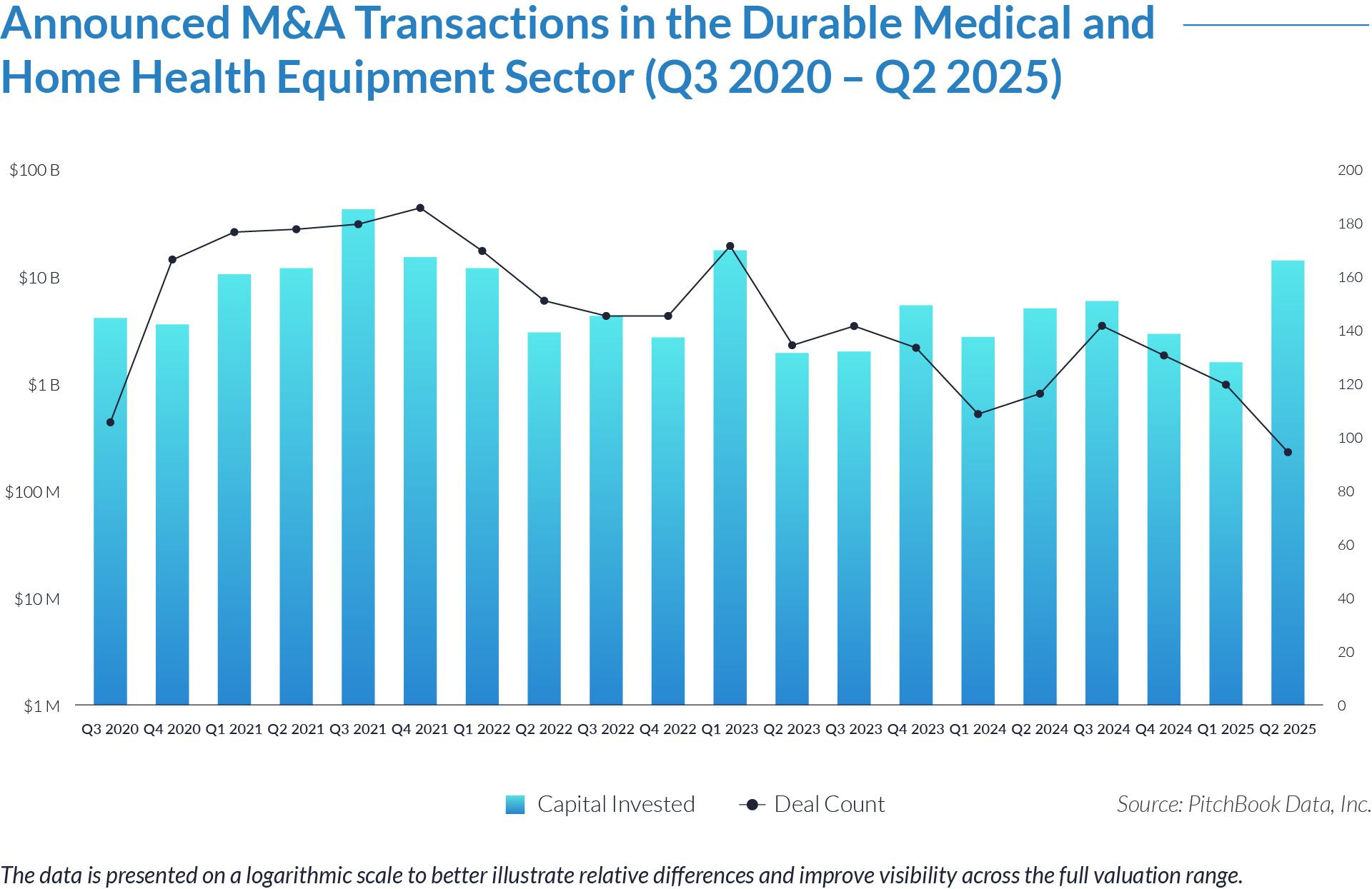 - The 2023–2024 moderation marked a shift from growth-at-any-price toward disciplined acquisitions. With higher capital costs, acquirers targeted EBITDA-positive, operationally efficient assets over high-multiple growth plays. Capital deployment averaged $4 to 6 billion per quarter in this period, down sharply from 2021 peaks, though deal counts remained stable. The rebound in Q2 2025 ($14 billion across 95 deals) signals renewed platform-level consolidation, particularly in respiratory therapy, CPAP resupply, and home oxygen, segments that continue to command valuation premiums.