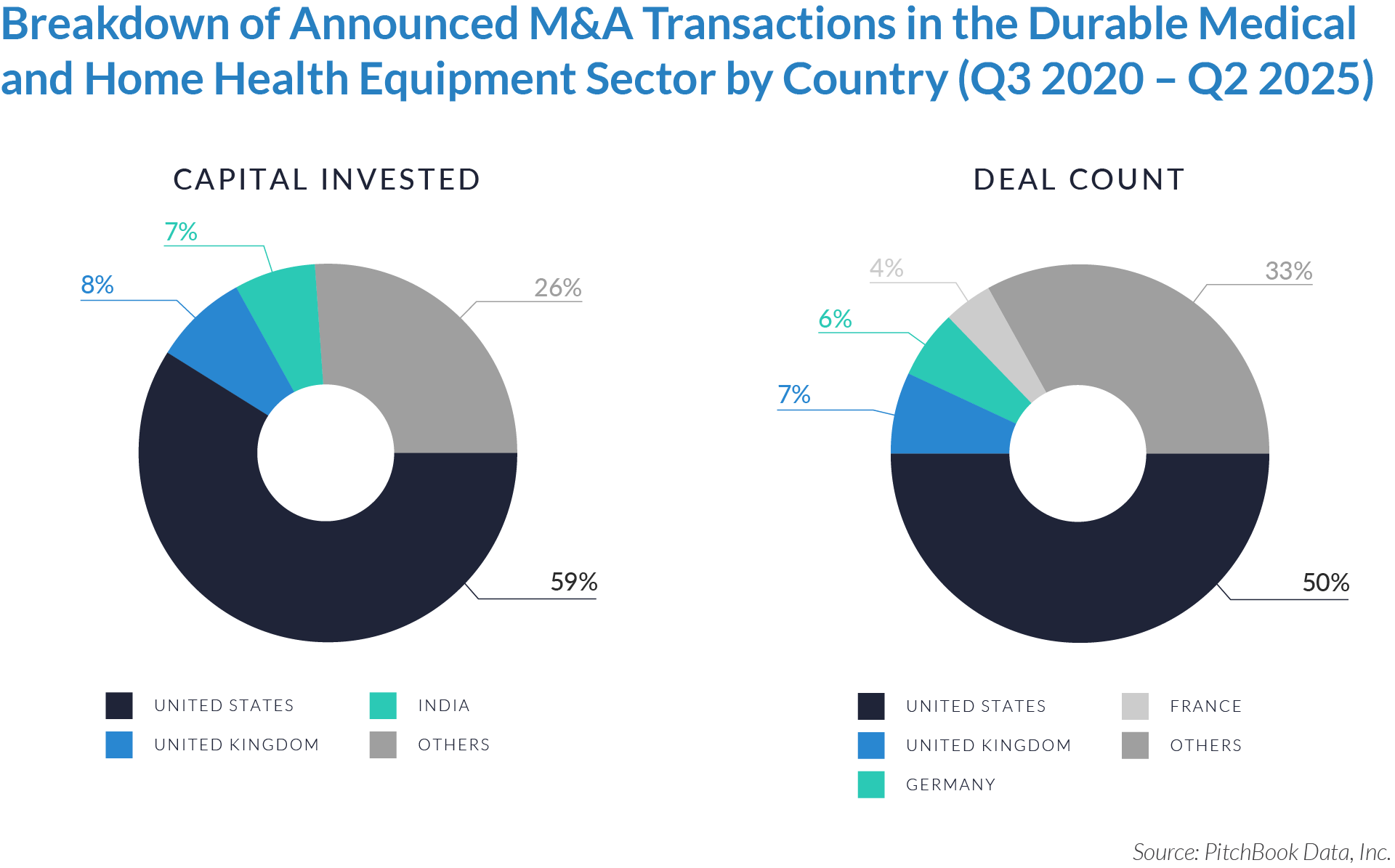 - US-based acquirers captured 59% of capital invested and 50% of deal flow, cementing the country’s role as the anchor of the Durable Medical and Home Health Equipment sector. Consolidators leveraged Medicare and Medicaid reimbursement, mature payer networks, and a fragmented operator base to build scale and capture premium valuations.