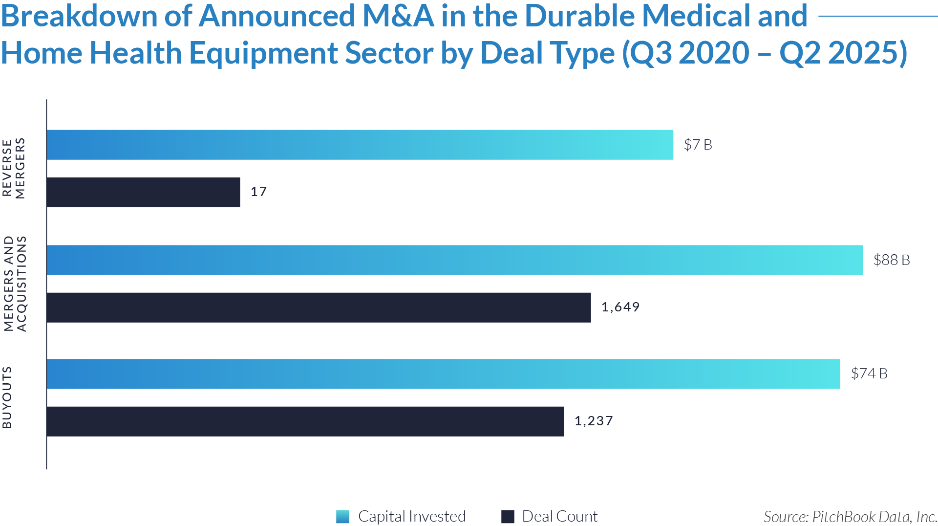 - Acquirers committed $74 billion across 1,237 buyout transactions, underscoring confidence in recurring revenue streams from CPAP resupply, oxygen therapy, and mobility equipment rentals, assets that provide reimbursement-backed cash flows capable of supporting leveraged acquisition structures.
